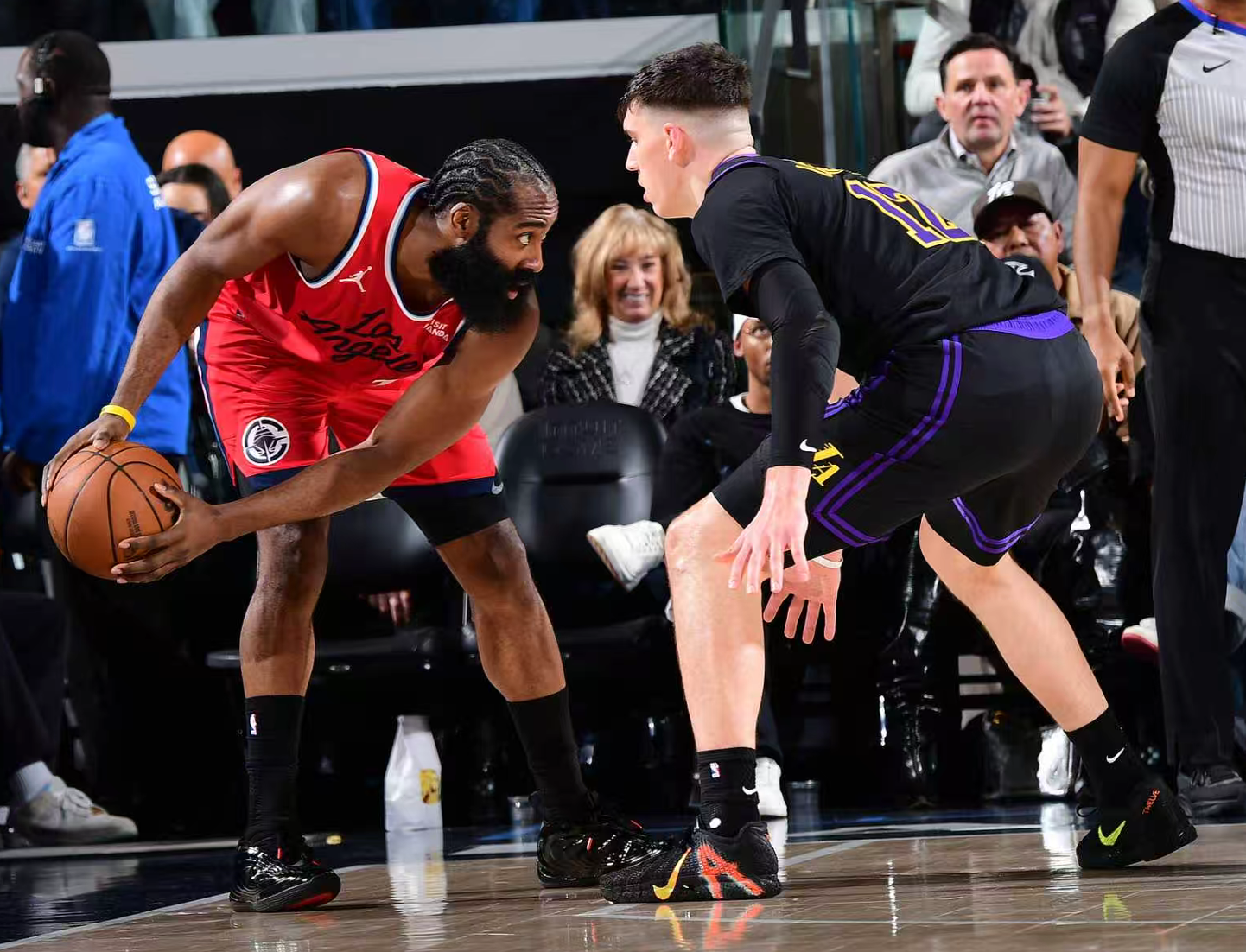 开场小卡的竞技状态很好连拿8分,拉拉维亚也命中两个三分球,两队的进攻都很流畅。乔丹-米勒与哈登也连续命中三分球,快船很快拉开到6分的差距,东契奇持球撤步三分球命中,米勒单打范德彪得手,八村三分不中,哈登反击上进打停湖人。好在八村命中一个压哨的三分球湖人缩小到个位数的分差进入次节。